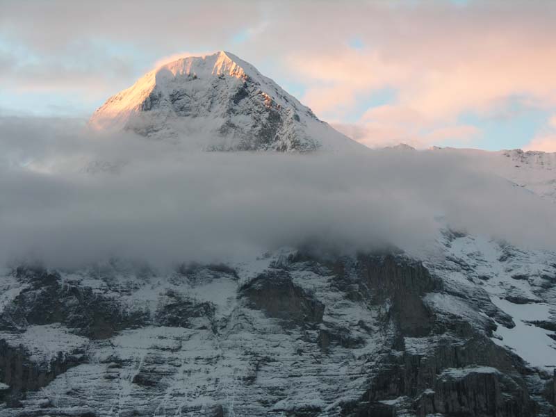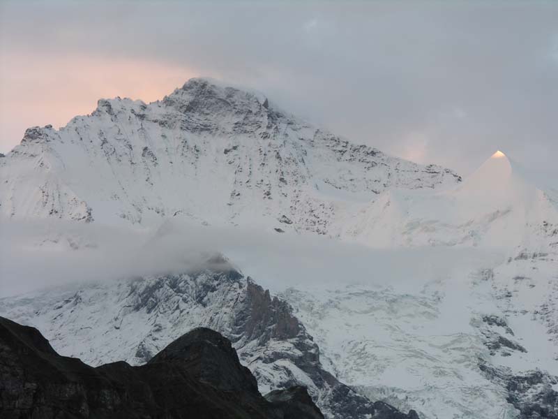 これはひょっとすると晴れるかも!5時50分アイガーの山頂に朝日が輝いた。やった!!!