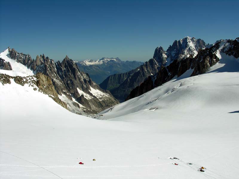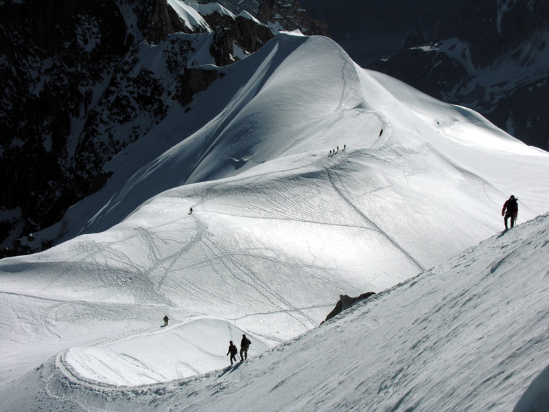 エギーユ・デュ・ミディ展望台より雪稜を下るクライマーたち。早朝しか見られない光景だ。