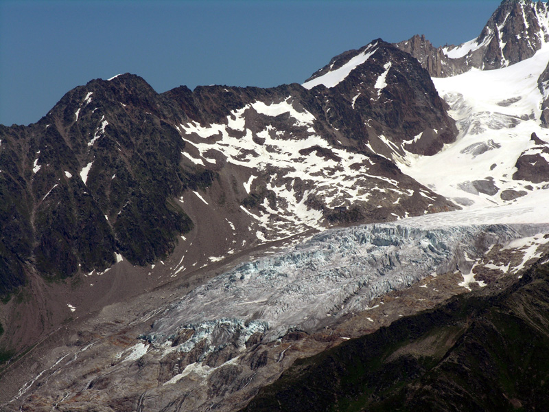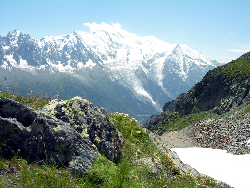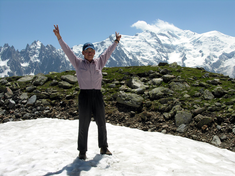 ロープウェイでプリジェールまで行き、さらにリフトでアンデックス展望台に到着。残雪の上で記念写真。真向かいにモンブランありました。