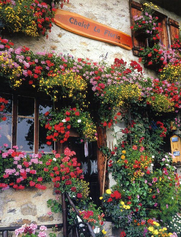 アクシデントです!プリジェールまで戻ったら、風のためロープウェイがストップです。しかたなしに予定に無いハイキングをしました。二時間半ああ疲れた。途中花で飾られた美しいレストランがありました。