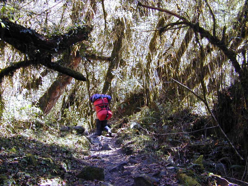 樹林帯を大きな荷物を担いで歩くポーター