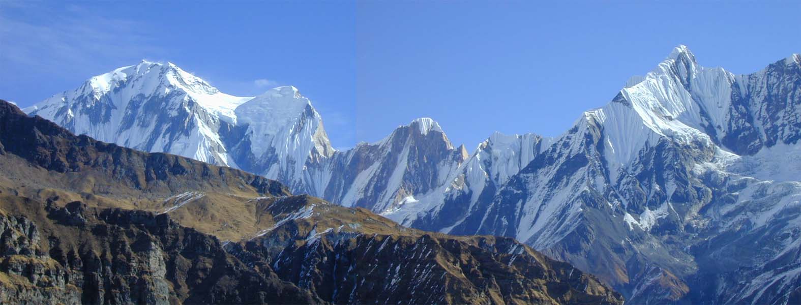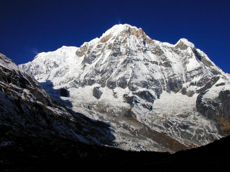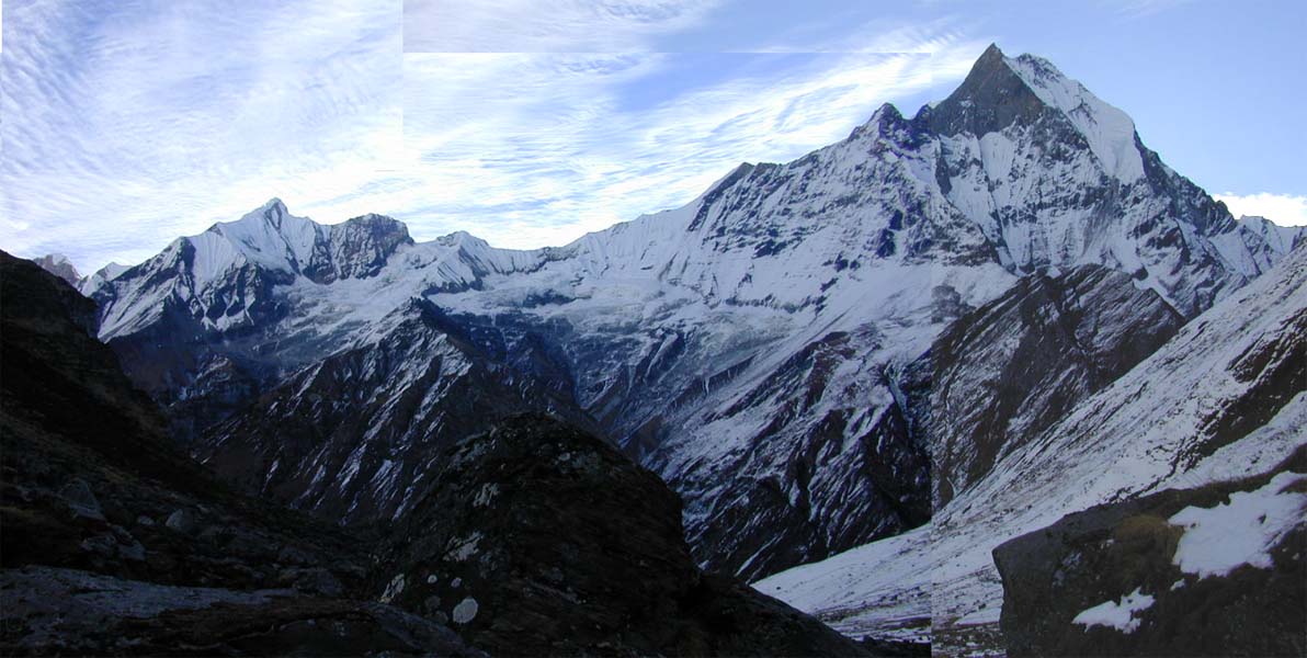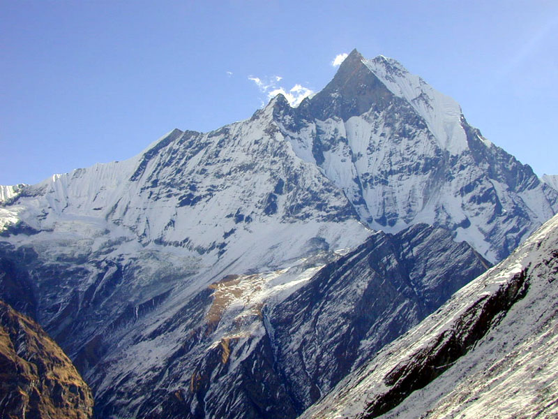 マチャプチュレの三角形の岸壁とアンナプルナV峰(7555m)