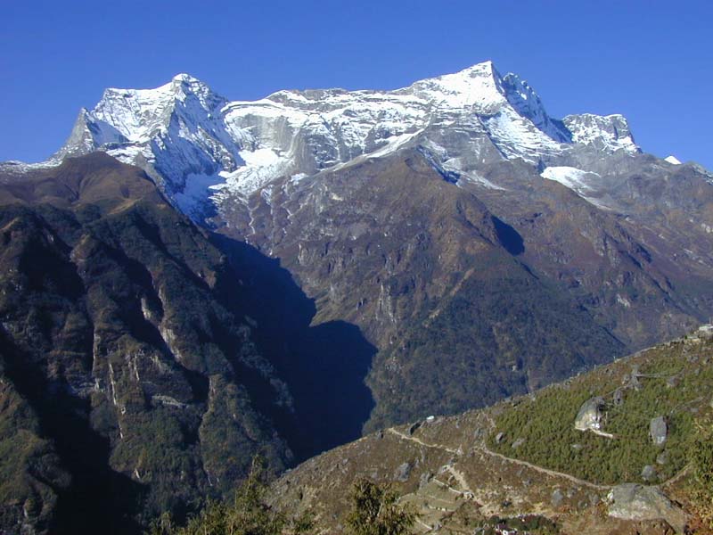 トクトとベンカールの途中で白銀に輝くタムセルク(6623m)が美しく見えました。夕暮れ時、やっとナムチェ・バザールに到きました。