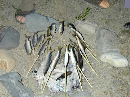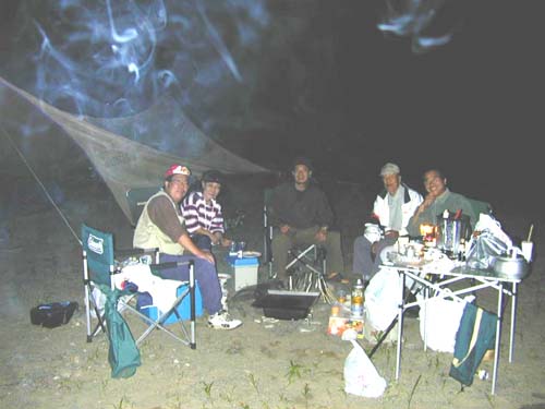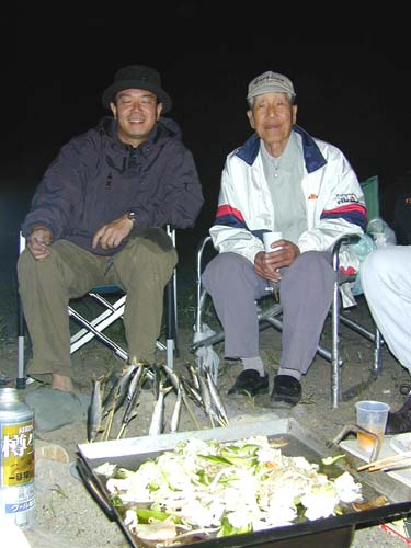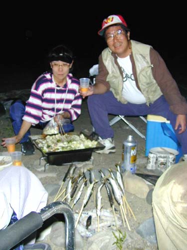 早速、串に刺して炭火で焼きました。ビール乾杯、深夜まで焼き肉パーティー。